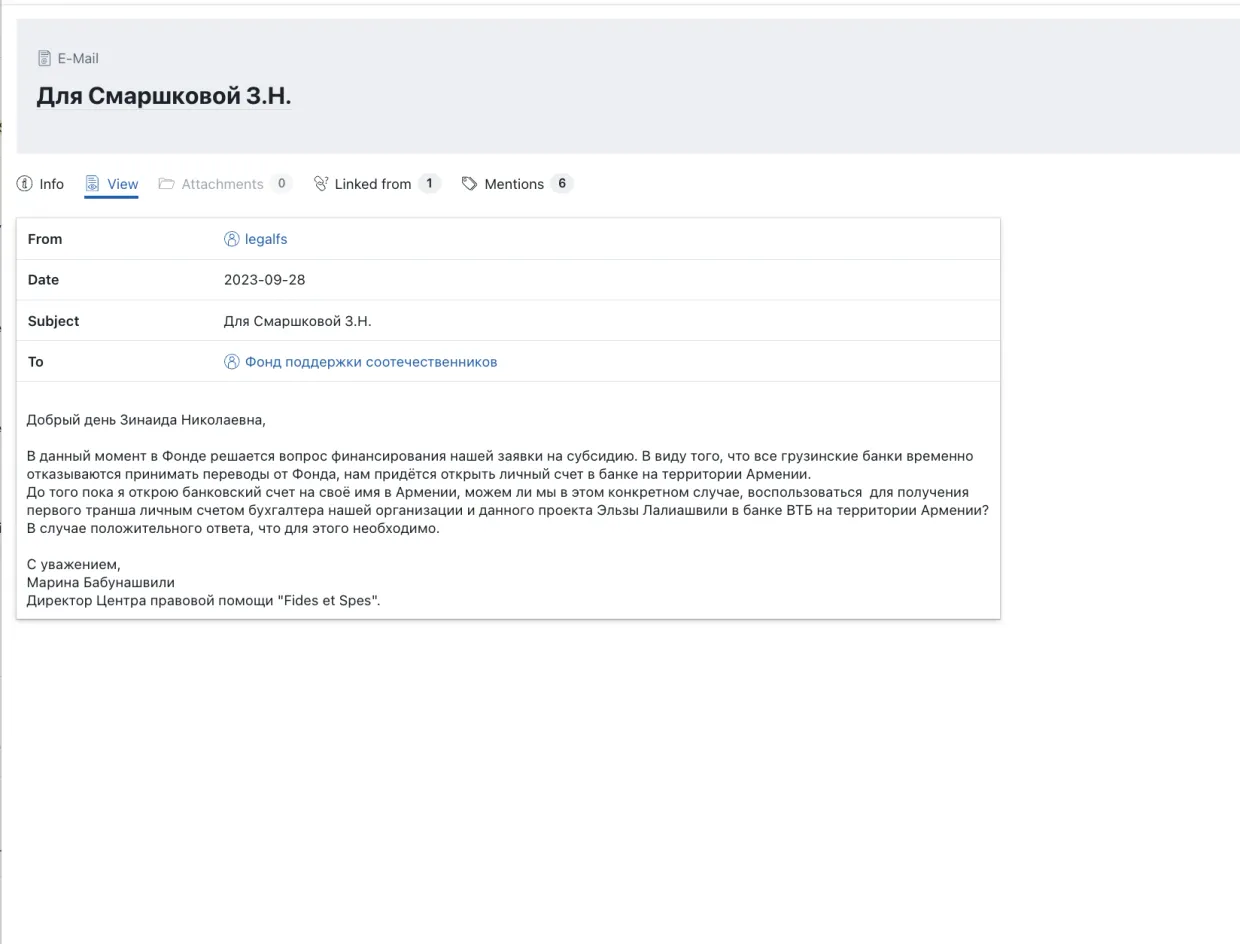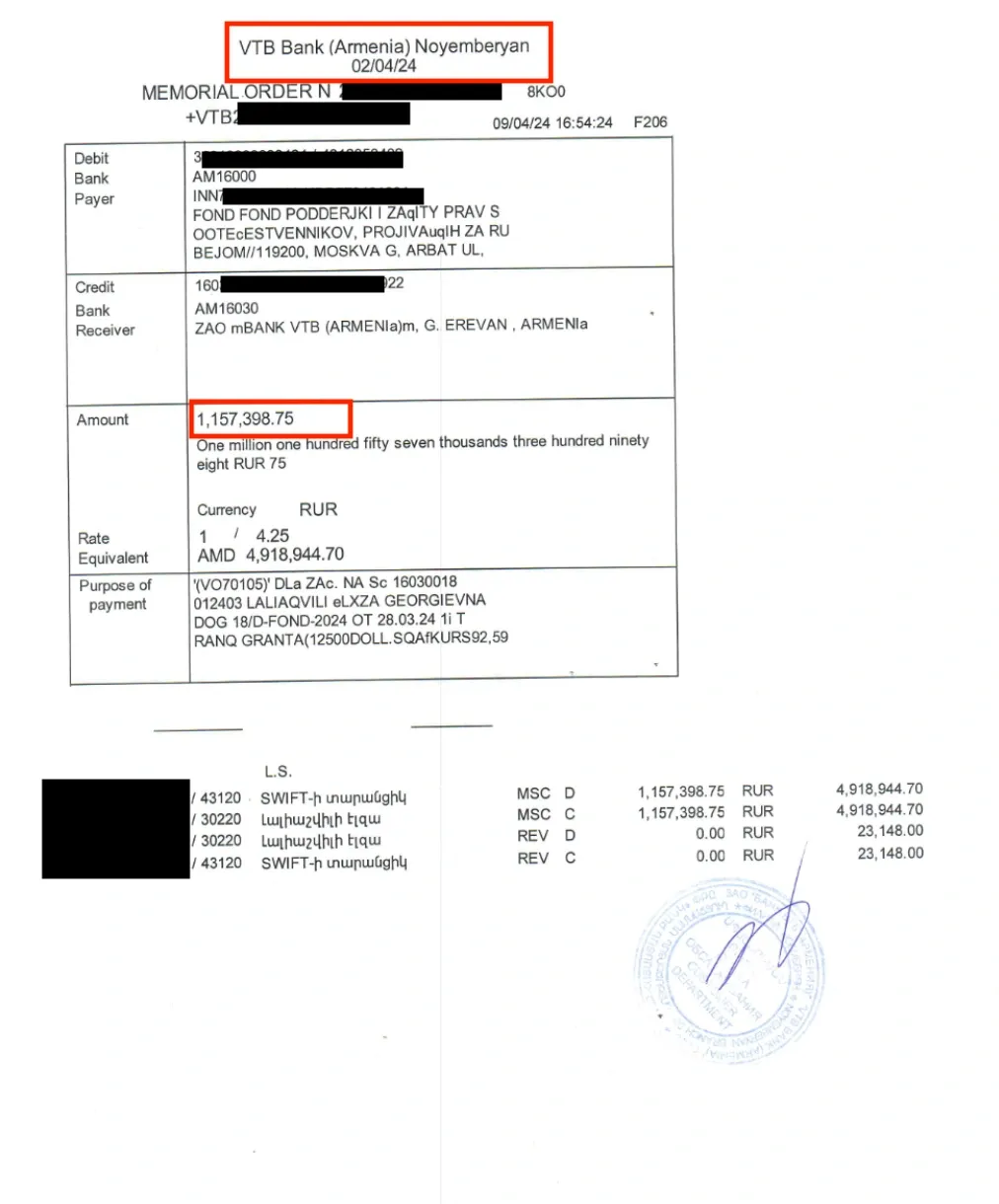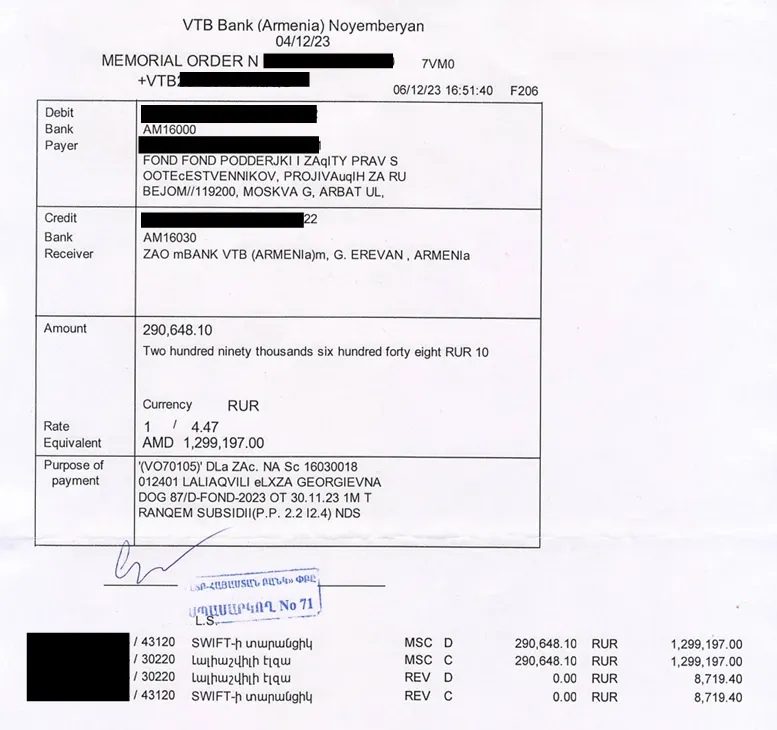 2022 წელს ბაბუნაშვილმა ფონდს მისწერა, ჩვენგან დამოუკიდებელი მიზეზების გამო, ქართულ ბანკებში ფულის ჩარიცხვის პრობლემა მექმნება და რეკვიზიტები უნდა შევცვალოო. ამ დროს, მის ორგანიზაციას “ს” ანგარიში ჰქონდა. რეკვიზიტები მართლაც მალე შეცვალეს და გრანტების მიღება “ლიბერთი ბანკში” გააგრძელეს. 2023 წლის სექტემბერში ფონდს ისევ მისწერა, დროებით ყველა ქართული ბანკი უარს აცხადებს ფონდიდან გადმორიცხული თანხის მიღებაზეო, ამიტომ იქნებ თანხა სომხეთში ჩარიცხოთ, ფიზიკური პირის ანგარიშზეო. თუმცა, სანამ მე გავხსნი ანგარიშს, ჩემი ბუღალტრის სომხური VTB ბანკი გამოიყენოთო. ფონდიც დასთანხმდა და 2024 წელს სომხეთში, მარინე ბაბუნაშვილის ცენტრის ბუღალტრის, ელზა ლალიაშვილის პირად ანგარიშზე, სულ მცირე, 1 448 046 რუბლი, ანუ 16 000 დოლარი ჩაირიცხა.
