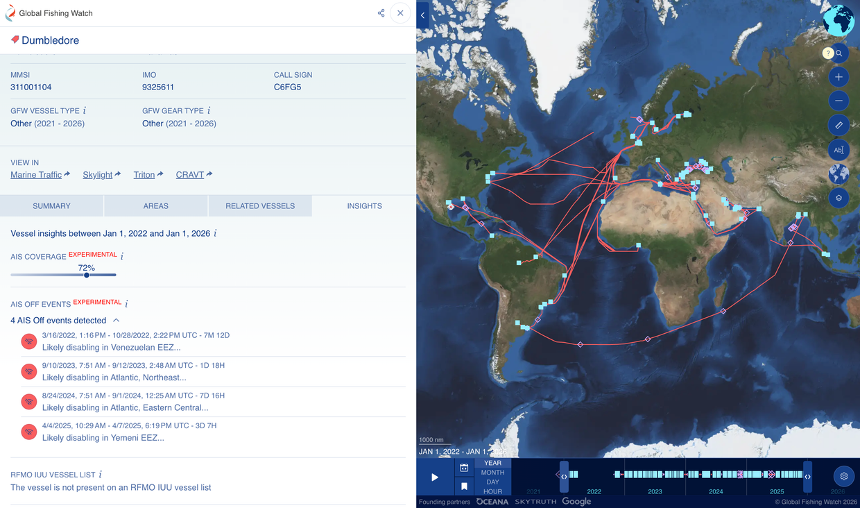 თურქეთიდან გამოსვლასა და საქართველოში ჩამოსვლის შუალედში, ტანკერმა DUMBLEDORE-მა მნიშვნელოვან “ტაქტიკურ ჩაქრობას” მიაგნო – სიგნალები მიზანმიმართულად გათიშა. VesselFinder-ზე ოქტომბრის ბოლოდან 27 ნოემბრამდე გემის ადგილმდებარეობის შესახებ ჩანაწერი არ იძებნება, ხოლო Global Fishing Watch-ის მონაცემები აჩვენებს, რომ ტანკერი 21 ნოემბრამდე ტრაპიზონის მახლობლად ტივტივებდა, რის შემდეგაც მისი სიგნალი სრულიად გაქრა. ის ხელახლა გამოჩნდა მხოლოდ 27 ნოემბერს, ფოთში შესვლისას. 3 დეკემბერს, ფოთის პორტში ხანმოკლე გაჩერების შემდეგ, ტანკერი ყულევში გადავიდა, დამატებით 8,700 ტონა ნავთობის მისაღებად. საქართველოში ტვირთის დამატების ეს პრაქტიკა, იმ ფონზე, რომ გემი უკვე დატვირთული იყო რუსული ნავთობით, იწვევს ტვირთის წარმომავლობების აღრევას. ეს პრაქტიკა, ანალიტიკოსების თქმით, ნავთობპროდუქტების პირველწყაროს დადგენას ართულებს.