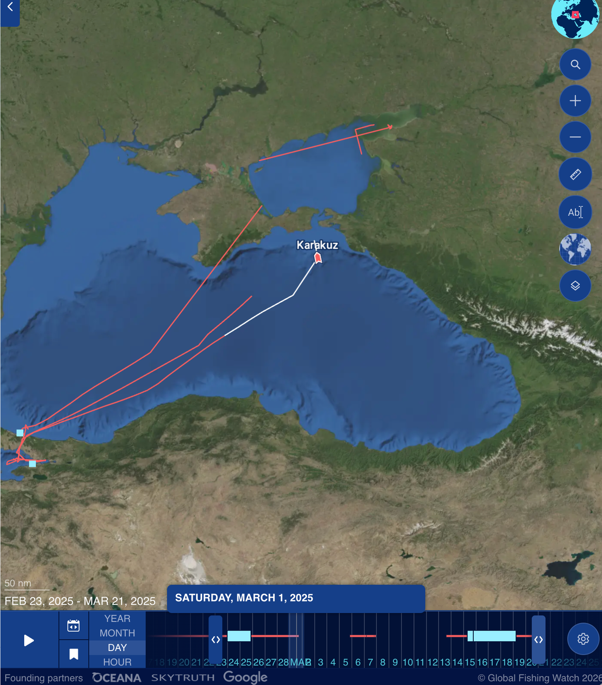KARAKUZ (IMO: 9621558) ამ სქემის კიდევ ერთი მონაწილეა. 2013 წელს აშენებული გემი, რომელსაც ადრე ALMETYEVSK ერქვა, აშშ-ის ფინანსთა სამინისტროს ინფორმაციით, 2016-2018 წლებში სირიაში ნავთობის ტრანსპორტირებაში იყო ჩართული. 2025 წლის 26 იანვარს იგი საქართველოში სანავიგაციო სისტემის გათიშვისა და მონაცემთა ფალსიფიკაციის შემდეგ შემოვიდა. საზღვაო მონიტორინგის სისტემების ანალიზის შემდეგ ჩვენ ვვარაუდობთ, რომ გემი ოკუპირებული ყირიმიდან გამოვიდა, თუმცა დოკუმენტაციაში მისმა ადმინისტრაციამ გასვლის წერტილად აზოვის პორტი მიუთითა.