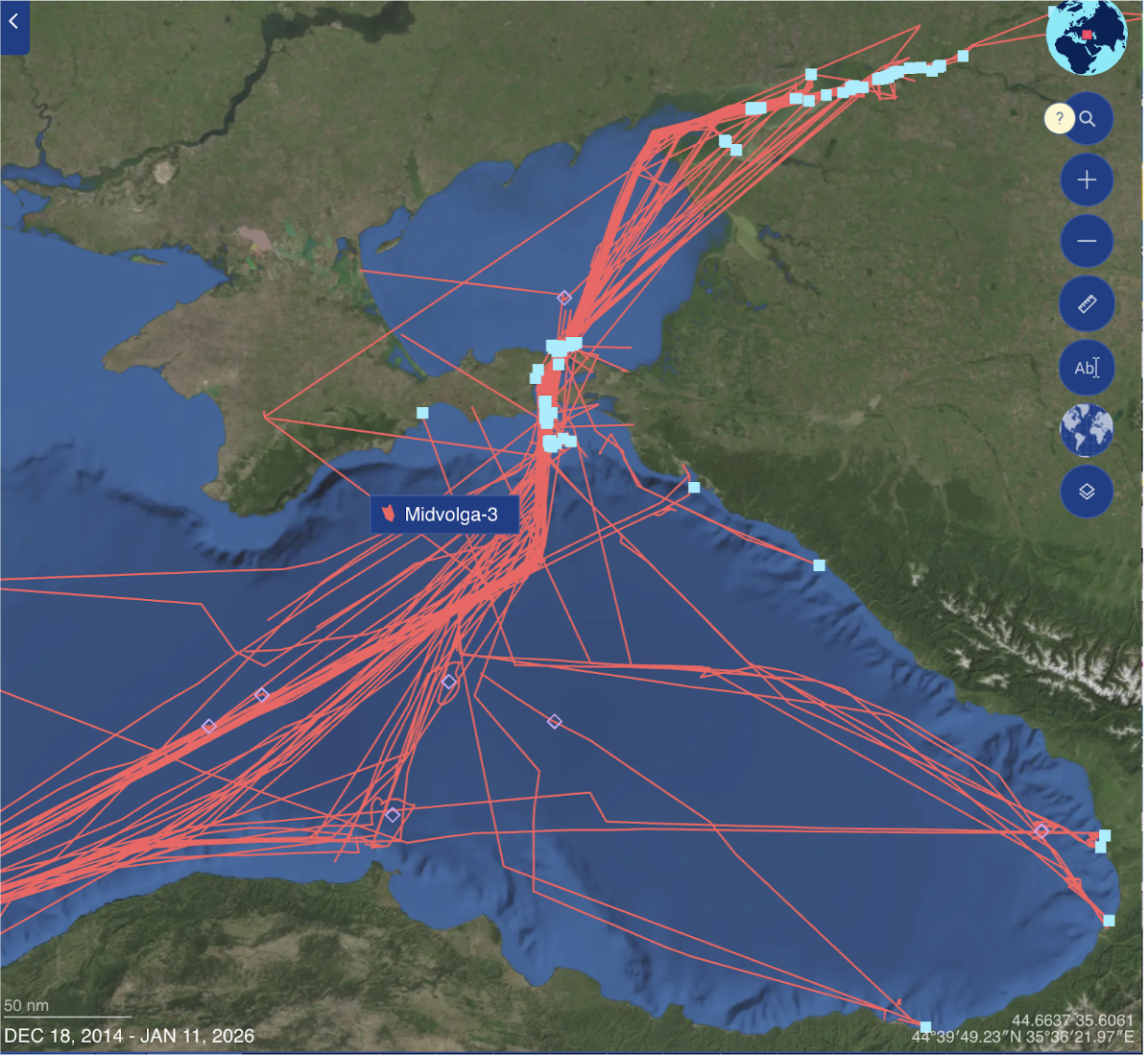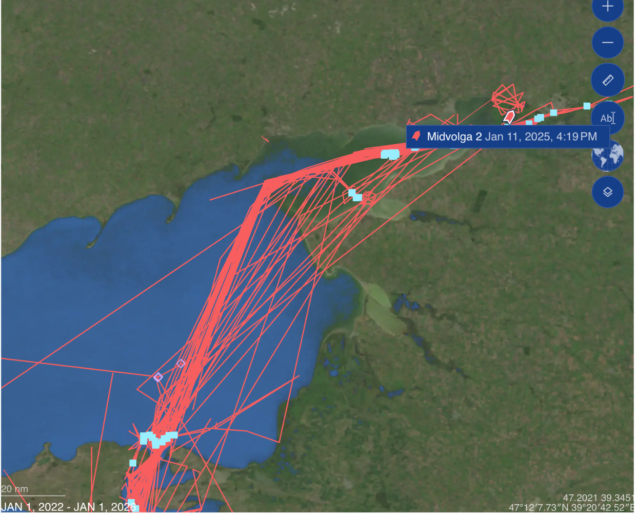 2024 და 2025 წლების საზღვაო მონიტორინგის მონაცემები ცხადყოფს, რომ MIDVOLGA-2 და MIDVOLGA-3 აყალბებდნენ კოორდინატებს, თიშავდნენ AIS სისტემებს და გადაადგილდებოდნენ რუსულ, უკრაინის ოკუპირებულ ტერიტორიებსა და საერთაშორისო პორტებს შორის.