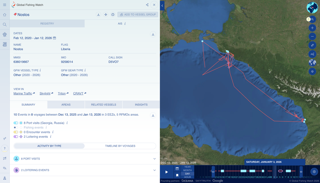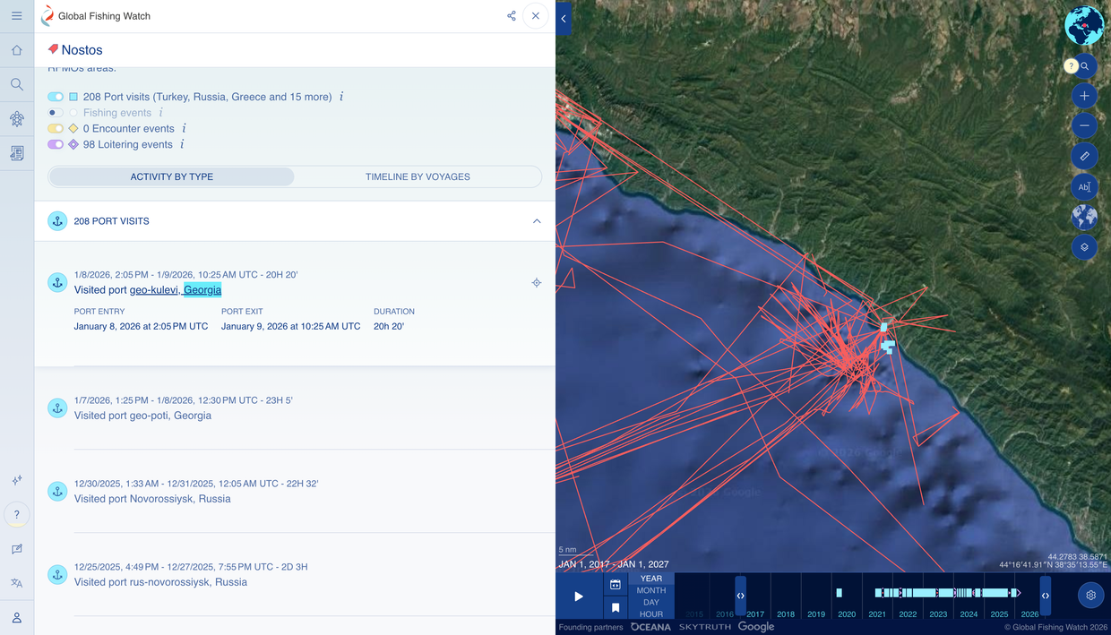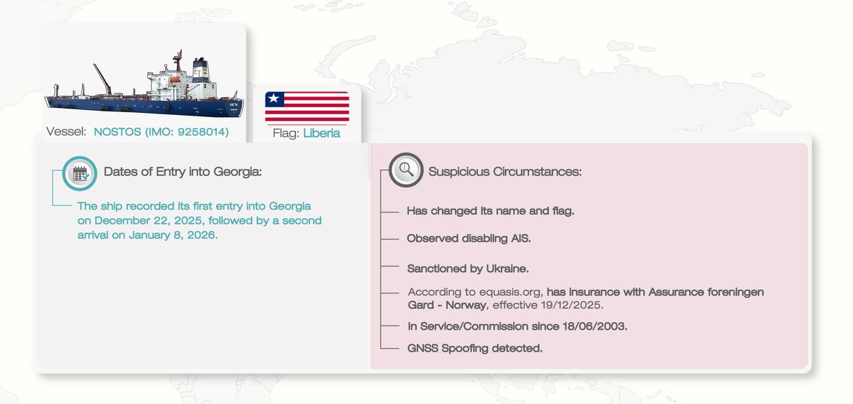 NOSTOS, 47 147-ტონიანი ტანკერი, საქართველოს პორტებში ნოვოროსიისკიდან 2025 წლის დეკემბერსა და 2026 წლის იანვარში შემოვიდა. ბათუმელების მიერ 12 იანვარს გამოქვეყნებულ მასალაში წერია, რომ შემოსავლების სამსახურში მათ შემთხვევით დაუდასტურეს, რომ ნედლი ნავთობი ყულევის ნავთობგადამამუშავებელი ქარხნისთვის იყო განკუთვნილი.