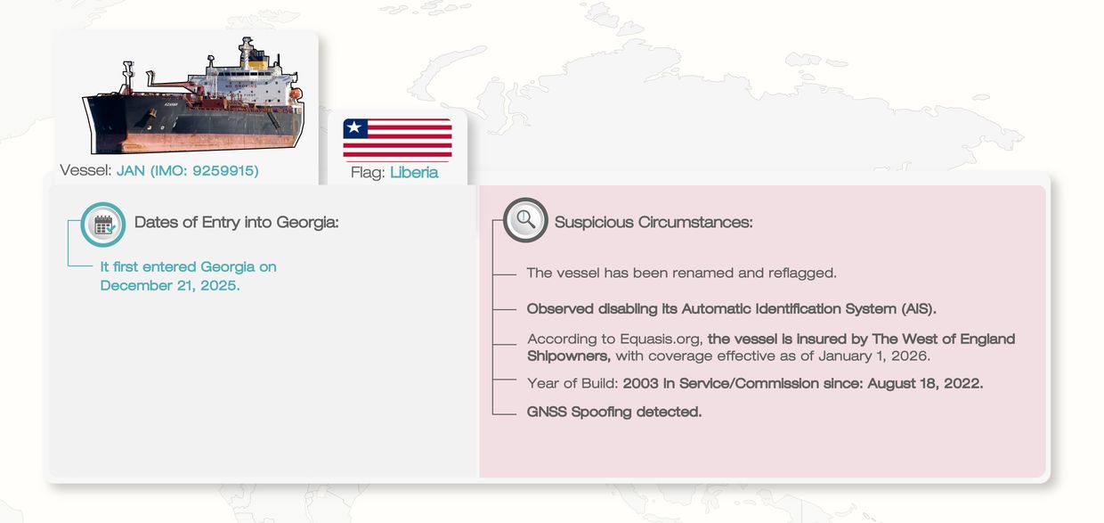 JAN – 35 647-ტონიანი ტანკერი, მცურავი ლიბერიის დროშის ქვეშ – ნოვოროსიისკიდან წამოვიდა და 2025 წლის 21 დეკემბერს ჯერ ფოთში, შემდეგ კი ყულევის პორტში შევიდა.