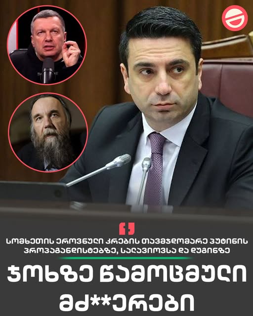 “ჯოხზე წამოცმული მძ**ერები” – თქვა სომხეთის ეროვნული კრების თავმჯდომარემ, ალენ სიმონიანმა პუტინის პროპაგანდისტ სალავიოვსა და დუგინზე მას შემდეგ, რაც მათ პუტინს სომხეთის წინააღმდეგ ომისკენ მოუწოდეს