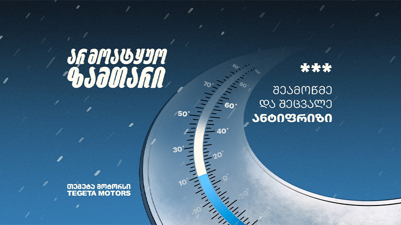 ზამთარში ავტომობილი განსაკუთრებულ ყურადღებას, შემოწმებასა და ზამთრის ამინდის შესაბამისი პროდუქტებით აღჭურვას მოითხოვს. სწორედ ამ საკითხს ეხმიანება „თეგეტა მოტორსის“ საკომუნიკაციო მესიჯიც „არ მოატყუო ზამთარი“ და მძღოლებს სიფრთხილისკენ მოუწოდებს. ცივ დღეებში ავტომობილის გამართულად მუშაობისა და უსაფრთხოდ გადაადგილებისათვის ერთ-ერთი მნიშვნელოვანი ფაქტორი ავტომობილში ანტიფრიზის რესურსის შემოწმებაა, რადგან ხარისხიანი და სწორად შერჩეული ანტიფრიზი იცავს ძრავს გადახურებისგან, აგრეთვე უზრუნველყოფს გაგრილების სისტემის შეპოხვას და იცავს მას გაყინვისგან.