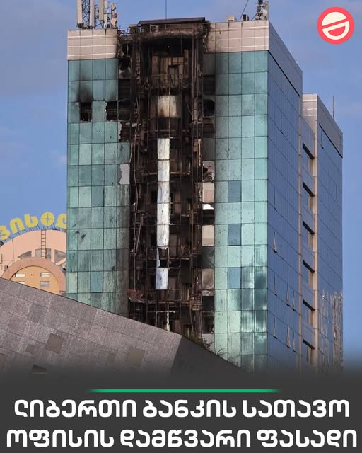 ასე გამოიყურება ჭავჭავაძის გამზირზე მდებარე ლიბერთი ბანკის სათავო ოფისის დამწვარი ფასადი | ადგილზე ხანძარი დღეს გამთენიისას, დაახლოებით 04:00 საათზე გაჩნდა. საგანგებო სიტუაციების მართვის სამსახურის ცნობით, შემთხვევის შედეგად არავინ დაშავებულა. როგორც უწყების ხელმძღვანელმა, თემურ მღებრიშვილმა ჟურნალისტებთან განაცხადა ცეცხლი დამხმარე ლიფტის შახტს გაუჩნდა.