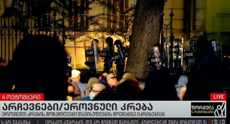 ადგილზე ჩანს სპეცდანიშნულების რაზმი, რომელმაც აქციის მონაწილეების წინააღმდეგ წიწაკის სპრეი გამოიყენა.