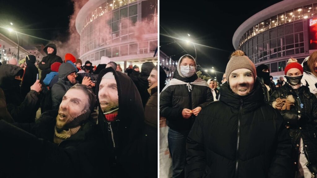 პროევროპული საპროტესტო დემონსტრაციების 52-ე დღეს თბილისში, ფილარმონიასთან დაწყებულ აქციაზე დემონსტრანტებმა, პროტესტის ნიშნად, სახეები დაიფარეს. ამ საპროტესტო აქტში მრავალი ათეული ადამიანი იღებს მონაწილეობას.