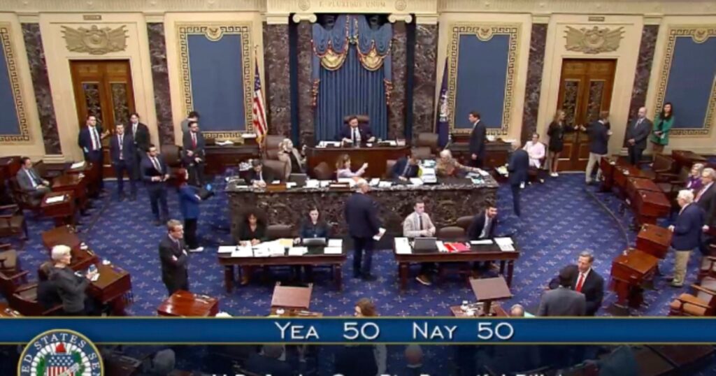 კანონპროექტს სენატში დიდი წინააღმდეგობა შეხვდა. საბოლოო კენჭისყრის შემდეგ ხმები ზუსტად შუაზე გაიყო და გადამწყვეტი ხმა ვიცე-პრეზიდენტმა ჯეი დი ვენსმა მისცა.