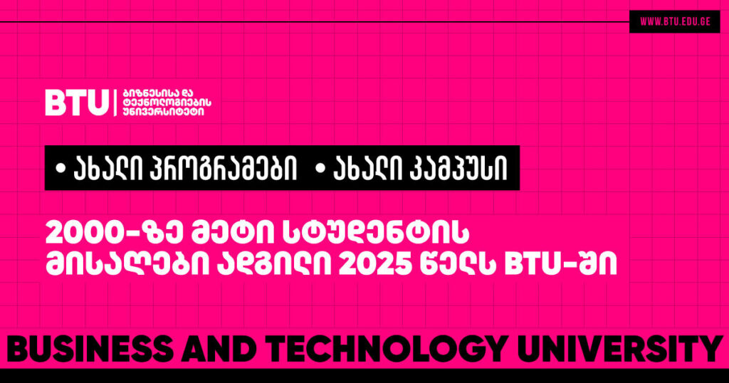 ახალი კამპუსი, ახალი ინოვაციური პროგრამები საბაკალავრო და სამაგისტრო საფეხურებზე, უპრეცედენტო ინიციატივები ხელოვნური ინტელექტისა თუ სხვა ტექნოლოგიების სფეროებში, სამწლიანი პროგრამები, ერთდროულად ორი დიპლომის მოპოვების შესაძლებლობა – ეს ის სიახლეებია, რომელსაც ბიზნესისა და ტექნოლოგიების უნივერსიტეტი 2025 წლიდან სტუდენტებს სთავაზობს.