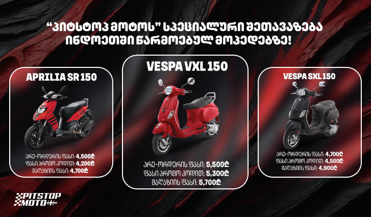 მაღაზია იწყებს ინდოეთში წარმოებული, ლეგენდარული „ვესპასა“ და „აპრილიას“ წინასწარი გაყიდვების (Pre-order) კამპანიას. 20 იანვრამდე თქვენ გაქვთ უნიკალური შანსი, გახდეთ პრემიუმ კლასის მოპედის მფლობელი სპეციალურ ფასად.