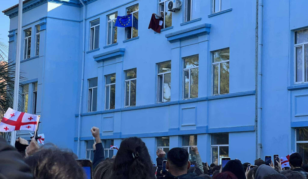 ბათუმში, საზღვაო აკადემიის ეზოში მთავარ შესასვლელი კარი სტუდენტებმა გახსნეს და სასწავლებლის ეზოში შევიდნენ.
