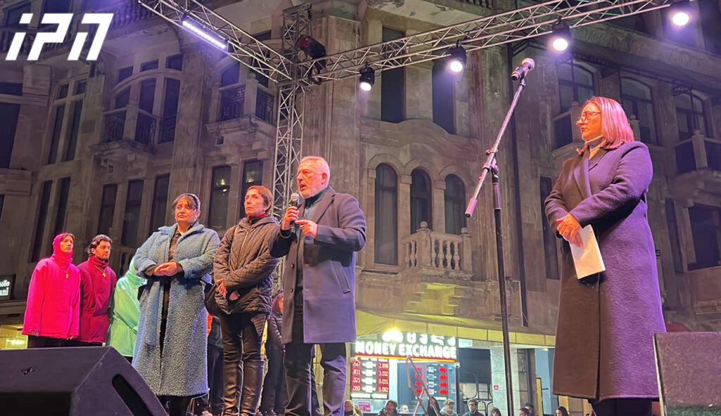 „ახალი თეატრის“ მსახიობები და აქციებზე დაკავებულთა მშობლები შეკრებილ მოქალაქეებს სიტყვით მიმართავენ.