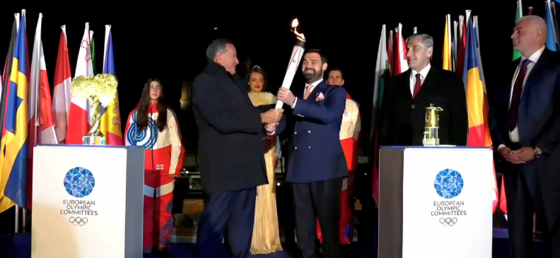 რომელმაც შესავალი სიტყვის შემდეგ, სცენაზე მოიწვია ევროპის ოლიმპიური კომიტეტების პრეზიდენტი სპიროს კაპრალოსი. მან ხაზი გაუსვა „მშვიდობის ცეცხლის“ სიმბოლურ მნიშვნელობას, ოლიმპიური მოძრაობის განსაკუთრებულ როლს თანამედროვე მსოფლიოში და გამოთქვა რწმენა, რომ საქართველოში გასამართი ახალგაზრდული ოლიმპიური ფესტივალი მაღალ დონეზე ჩატარდება.