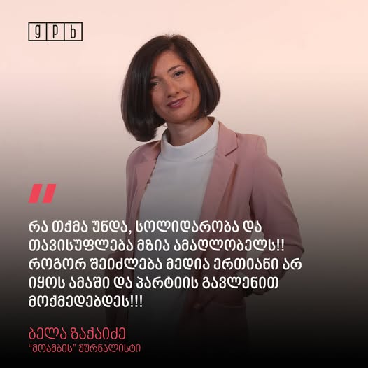 მაშინაც ასე იყო და ახლაც სამწუხაროდ, ასეა. მე მგონია სამსახურის დაკარგვის შიშით, ან სხვა პრივილეგიების დაკარგვის შიშით, ხმა ვერ ამოვიღოთ, როდესაც ჩვენს კოლეგებს სპეცრაზმელები პირდაპირ ეთერებში ძვლებში ამტვრევენ, სისხლის სამართლის მუხლით აკავებენ და 7 წლამდე პატიმრობა ემუქრებათ, წარმოუდგენელია. რა თქმა უნდა, სოლიდარობა და თავისუფლება მზია ამაღლობელს!! როგორ შეიძლება მედია ერთიანი არ იყოს ამაში და პარტიის გავლენით მოქმედებდეს!!!” – წერს სოციალურ ქსელში ბელა ზაქაიძე, “მოამბის” ჟურნალისტი.