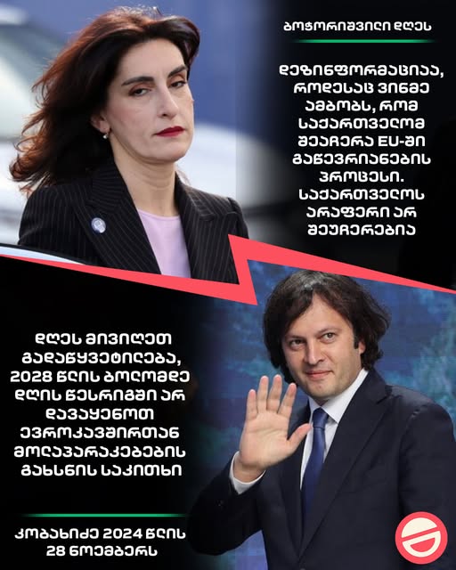 ბოჭორიშვილი დღეს: “ეს არის დეზინფორმაცია და მანიპულაცია, როდესაც ვინმე ამბობს, რომ საქართველომ შეაჩერა ევროკავშირში გაწევრიანების პროცესი. მარტივად, ეს წინადადება არის ტყუილი. საქართველოს არაფერი არ შეუჩერებია”
