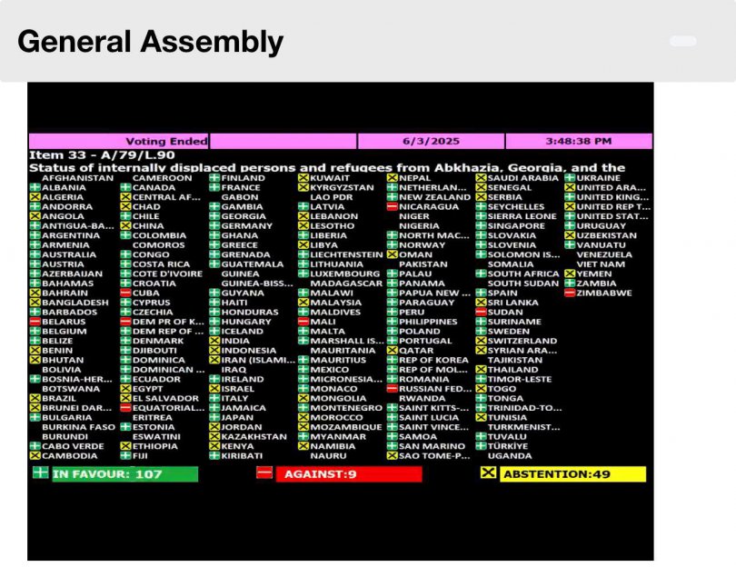 გაეროს გენერალურმა ასამბლეამ 3 ივნისს კიდევ ერთხელ დაუჭირა მხარი საქართველოს სუვერენიტეტსა და ტერიტორიულ მთლიანობას. ასამბლეამ მიიღო რეზოლუცია „იძულებით გადაადგილებულ პირთა და ლტოლვილთა სტატუსის შესახებ დან და ცხინვალის რეგიონიდან/სამხრეთ ოსეთიდან, საქართველო“, რომელსაც მხარი 107 ქვეყანამ დაუჭირა, 9 წინააღმდეგ წავიდა, ხოლო 49-მა თავი შეიკავა.