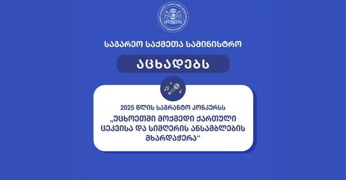 საქართველოს საგარეო საქმეთა სამინისტრო აცხადებს 2025 წლის საგრანტო კონკურსს – „უცხოეთში მოქმედი ქართული ცეკვისა და სიმღერის ანსამბლების მხარდაჭერა“.