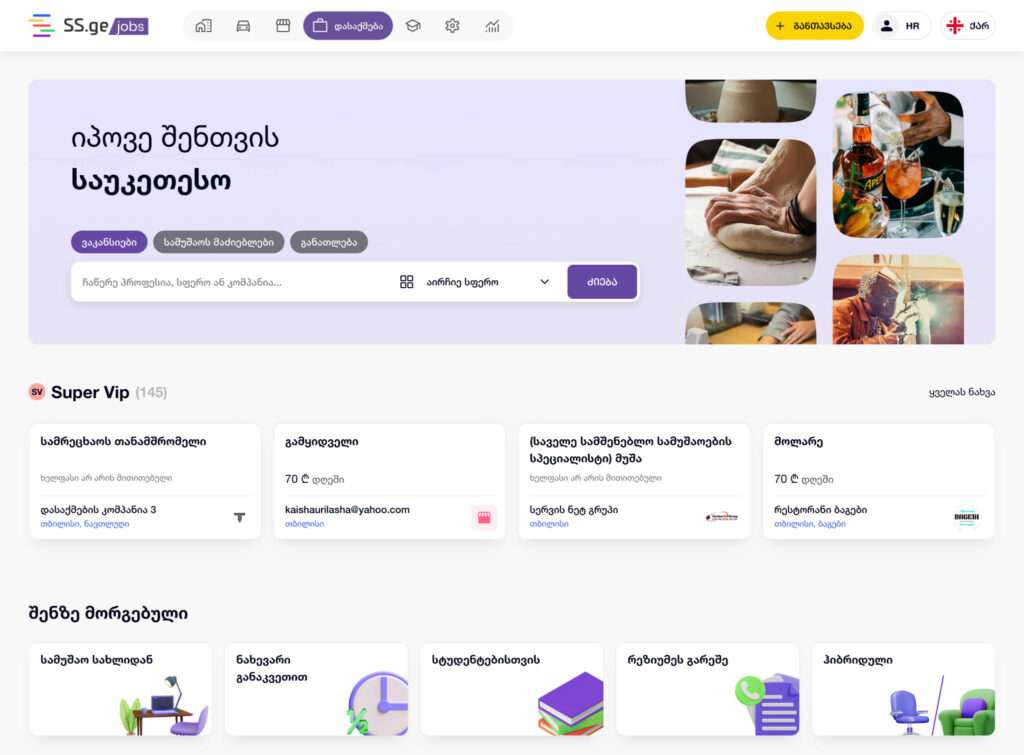 განახლებული jobs.ss.ge მომხმარებლის გამოცდილებაზეა მორგებული, დახვეწილია ფუნქციონალი და შექმნილია იმისათვის რომ კადრის შერჩევის თითოეული ეტაპი იყოს, რაც შეიძლება სწრაფი და მოსახერხებელი. საიტზე, პირდაპირ პირადი კაბინეტიდან, HR მენეჯერებს, კომპანიის წარმომადგენლებს ან ფიზიკურ პირებს თავად შეუძლიათ განცხადებების განთავსება და რედაქტირება ნებისმიერ დროს. ხოლო თუ ამ ყველაფერში დახმარება დაგჭირდებათ პირადი ასისტენტის უფასო სერვისით შეგიძლიათ ისარგებლოთ, რომელიც დაგეხმარებათ მარტივად შეადგინოთ ვაკანსიის ტექსტი და გაიგოთ, რომელი ფასიანი სერვისის გამოყენება იქნება უკეთესი, რათა თქვენს მიერ ატვირთულმა განცხადებამ სასურველ შედეგს მიაღწიოს.