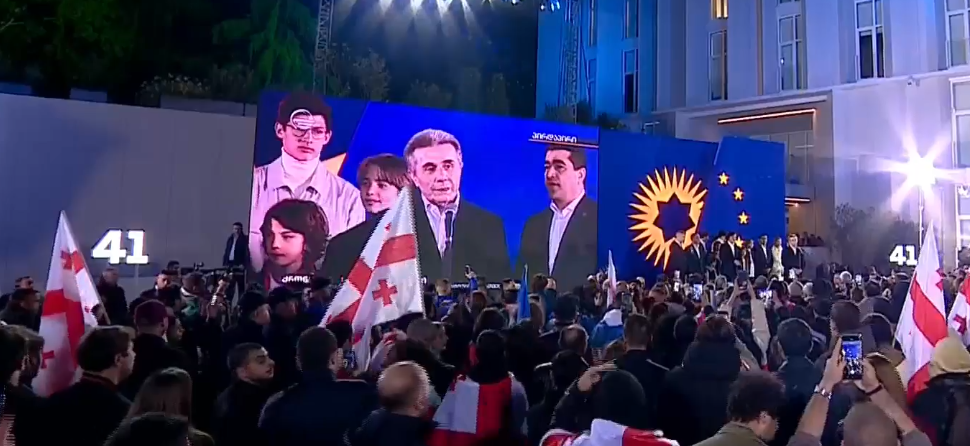 ამ წუთებში „ქართული ოცნების“ ცენტრალური ოფისის წინ მოწყობილ სპეციალურ სცენაზე სიტყვით გამოდიან პარტიის ლიდერები. ისინი ეგზიტპოლების შედეგებს ზეიმობენ, რომლის მიხედვითაც ქართულ ოცნებას 56.1% აქვს.