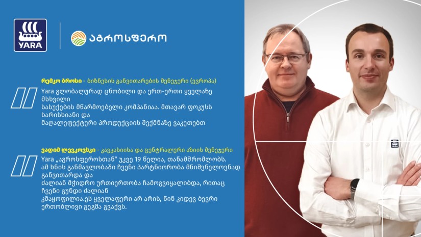 ინოვაციური სასუქების ერთ-ერთი უმსხვილესი მწარმოებელი კომპანიის, Yara-ს წარმომადგენლები – ბიზნესის განვითარების მენეჯერი ევროპაში, რემკო ბროსი და კავკასიისა და ცენტრალური აზიის ქვეყნების მენეჯერი, ვადიმ ლევკოვსკი საქართველოს ეწვივნენ. ვიზიტის ფარგლებში, სტუმრებმა პარტნიორ კომპანია „აგროსფეროსთან“თანამშრომლობის გაღრმავებაზე იმსჯელეს. ამასთანავე, წარადგინეს პროდუქციის ახალი ხაზი, რომელიც ქართულ ბაზარზე სულ მალე შემოვა.