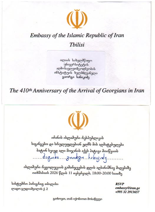 საკმაოდ დიდი გამოხმაურება მოჰყვა ირანის რევოლუციისადმი მიძღვნილ საზეიმო მიღებაზე ხელისუფლების წარმომადგენლების მისვლას და მისასალმებელი სიტყვით გამოსვლასაც. ჩემი პროფესიიდან გამომდინარე, მოწვევა მეც მივიღე, მაგრამ დღეს ირანში არსებული სიტუაციიდან გამომდინარე, არ ჩავთვალე მიზანშეწონილად მისვლა. ამ პოსტით კი ერთ მეტად საყურადღებო ნიუანსს მინდა გავუსვა ხაზი. მოწვევის კონვერტს აწერია The 410thy Anniversary of the Arrival of Georgians in Iran – გამოდის 1616 წელი – შაჰა აბასის ლაშქრობების დროს (1613-1617) კახეთის მოსახლეობის დიდი ნაწილის გაწყვეტა ირანელების მიერ და გადარჩენილების მნიშვნელოვანი ნაწილის ძალადობრივი გადასახლება ირანში.