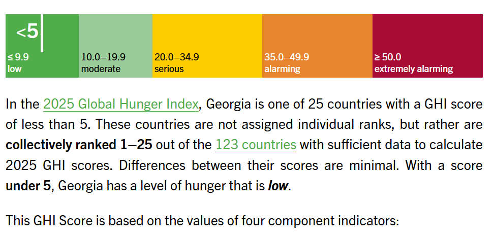 2025 წლის გლობალური შიმშილის ინდექსის მიხედვით საქართველო საუკეთესო ოცდახუთ ქვეყნას შორის მოხვდა და პრობლემისგან თავისუფლებით პირველ პოზიციაზეა. რაც იმას ნიშნავს, რომ უკიდურესი სიღარიბის გამომხატველი ეს პრობლემა, საქართველოში მოწინავე დონეზე და დადებითად არის გადაწყვეტილი.