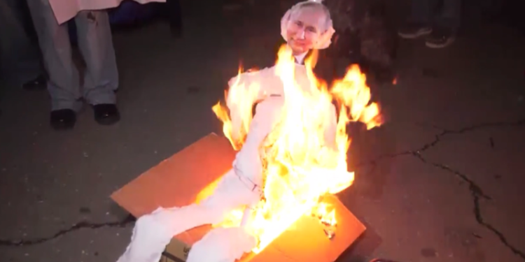 გორის საკრებულოს შენობასთან პუტინის ფიტული დაწვეს. “ნაომარი ქალაქი ბოდიშს არ იხდის” – ამბობენ პროტესტის მონაწილეები გორში, რომლებმაც რუსული სიასტიკე 2008 წელს საკუთარ თავზე გადაიტანეს.