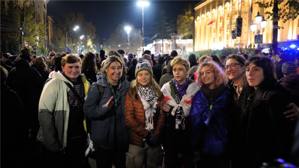 4 ნოემბერს თბილისში, რუსთაველის გამზირზე, მყოფმა თუნბერგმა მხარი დაუჭირა საქართველოს ოპოზიციას, რომელიც გაყალბებულად მიიჩნევს 26 ოქტომბრის საპარლამენტო არჩევნების შედეგებს და საპროტესტო აქციებს მართავს.