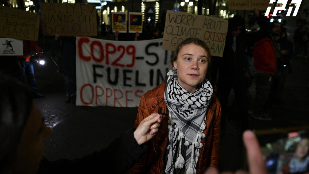 მოგვიანებით, შვედი ეკოაქტივისტი გრეტა თუნბერგი სხვა აქტივისტებთან ერთად რუსთაველის გამზირზე, პარლამენტის წინ მიმდინარე აქციას შეუერთდა. ცნობისთვის, მანამდე შვედი ეკოაქტივისტი აზერბაიჯანში მიმდინარე კლიმატის ცვლილებების კონფერენციას აპროტესტებდა თავისუფლების მოედანზე. როგორც აქტივისტები აცხადებენ, აზერბაიჯანში აღნიშნული კონფერენციის ჩატარება არ შეიძლება, რადგან აზერბაიჯანი ავტორიტარული ქვეყანაა, სადაც კრიტიკული სამოქალაქო საზოგადოება იდევნება. ასევე, რუსთაველის გამზირზე 19:00 საათიდან მოქალაქეები იკრიბებიან, რომლებიც 26 ოქტომბრის საპარლამენტო არჩევნებში დამდგარ შედეგებს აპროტესტებენ.
