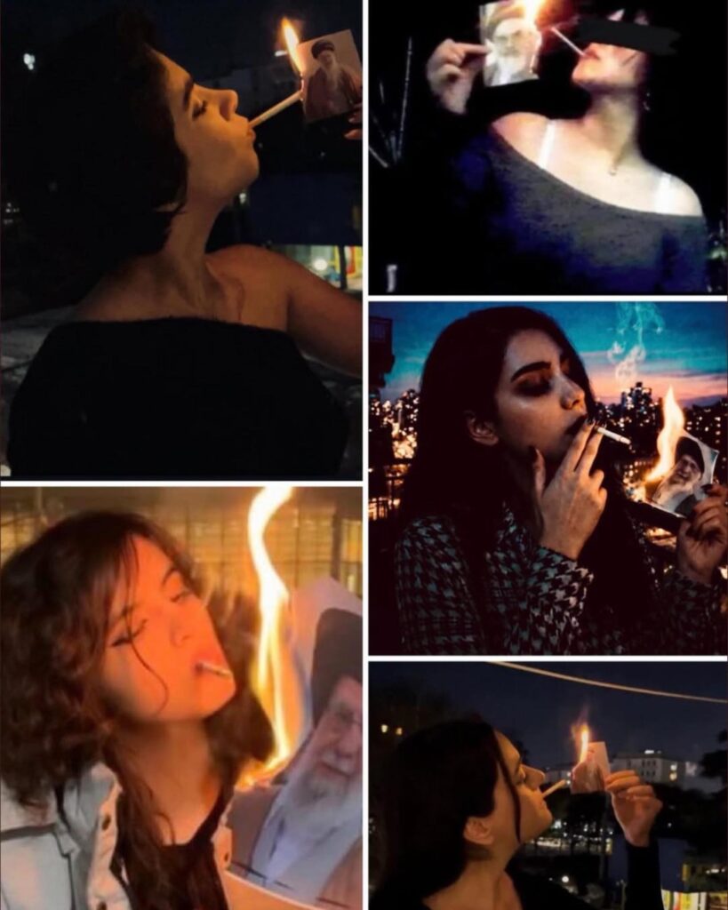 ფოტოკოლაჟზე ხედავთ ირანელ ქალებს, რომლებიც პროტესტის ნიშნად სიგარეტს უკიდებენ ირანის ისლამისტი დიქტატორის, ალი ხამენეის ალმოდებული პორტრეტიდან.