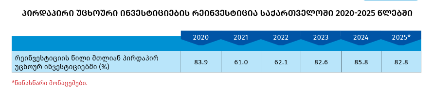 2025 წლის წინასწარი მონაცემებით სააქციო კაპიტალის მოცულობამ 601.8 მლნ. დოლარი შეადგინა, რაც წინა წლის დაზუსტებულ მაჩვენებელზე  15.3 პროცენტით მეტია, ხოლო რეინვესტიცია  წინა წლის დაზუსტებულ მაჩვენებელზე 3.8 პროცენტით მეტია და 1 397.8 მლნ აშშ დოლარს შეადგენს.