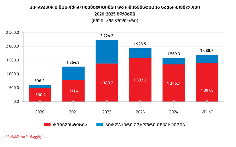 საქართველოს ეროვნული სტატისტიკის მიერ გამოქვეყნებული წინასწარი მონაცემებით, საქართველოში განხორციელებული პირდაპირი უცხოური ინვესტიციების მოცულობამ 2025 წელს 1 688.7 მლნ. დოლარი შეადგინა, რაც 7.6 პროცენტით მეტია 2024 წლის დაზუსტებულ მაჩვენებელზე. ზრდა განპირობებულია პირდაპირი უცხოური ინვესტიციების ორი კომპონენტის: სააქციო კაპიტალისა და რეინვესტიციის მაჩვენებლის ზრდით.