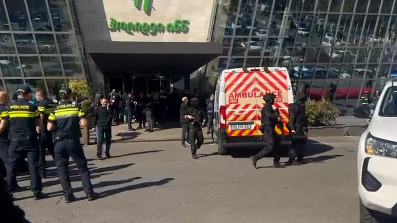 სასტუმროს შენობის მიმდებარედ სამაშველო სამსახურმა გასაბერი ლეიბი გაშალა. შენობაში უკვე შესულია სპეცრაზმი.