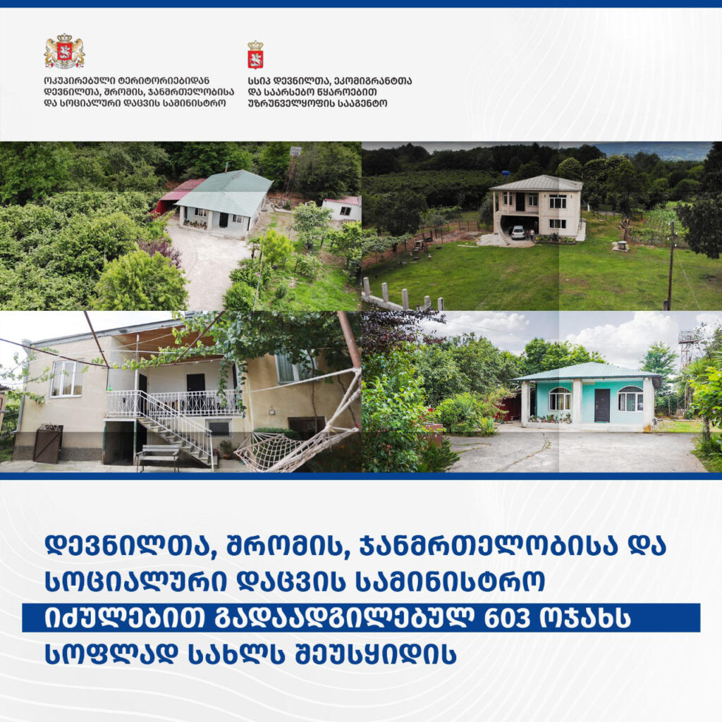 დევნილთა, შრომის, ჯანმრთელობისა და სოციალური დაცვის სამინისტრო იძულებით გადაადგილებულ 603 ოჯახს სოფლად სახლს შეუსყიდის.