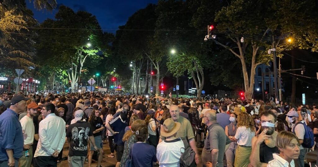 პროევროპული დემონსტრაციების 197-ე დღეს 21 წლის მათე დევიძის მხარდასაჭერად ფილარმონიასთან დაწყებული სპონტანური დემონსტრაცია, რომელიც თანდათანობით გაიზარდა, თბილისის სახელმწიფო უნივერსიტეტის პირველ კორპუსთან გრძელდება.