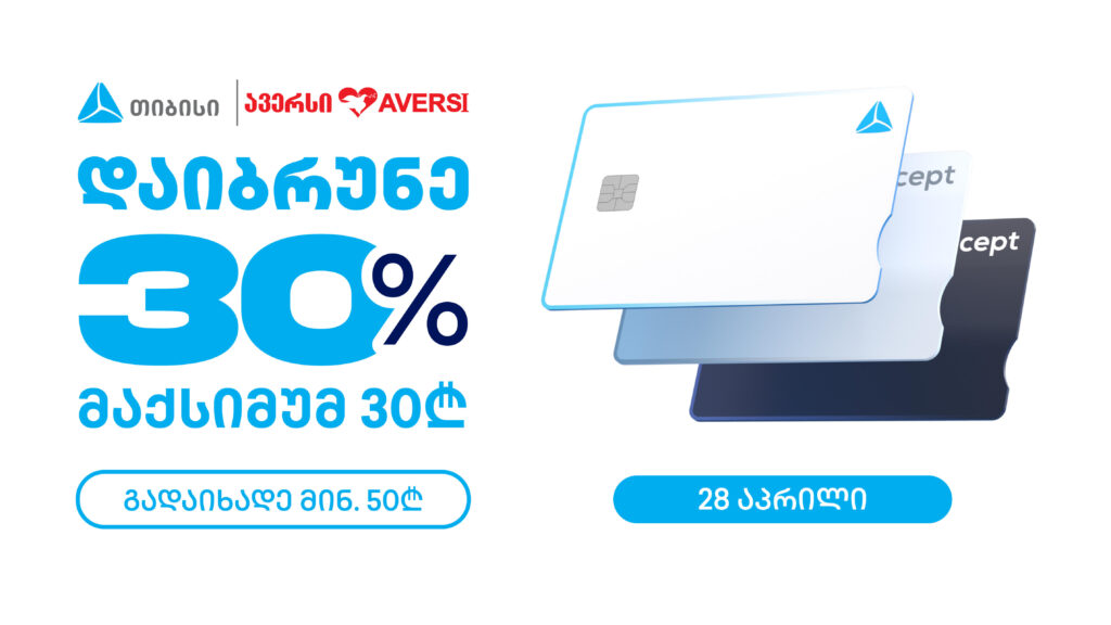 ახალი თიბისი ბარათით, ახალი თიბისი კონცეპტ ბარათით ან ერთგული საკრედიტო ბარათით „ავერსის“ აფთიაქებში მინიმუმ 50 ლარის ღირებულების ნებისმიერი პროდუქტის შეძენისას მომხმარებელი მომენტალურად დაიბრუნებს გადახდილი თანხის 30%-ს, მაქსიმუმ 30 ლარს.