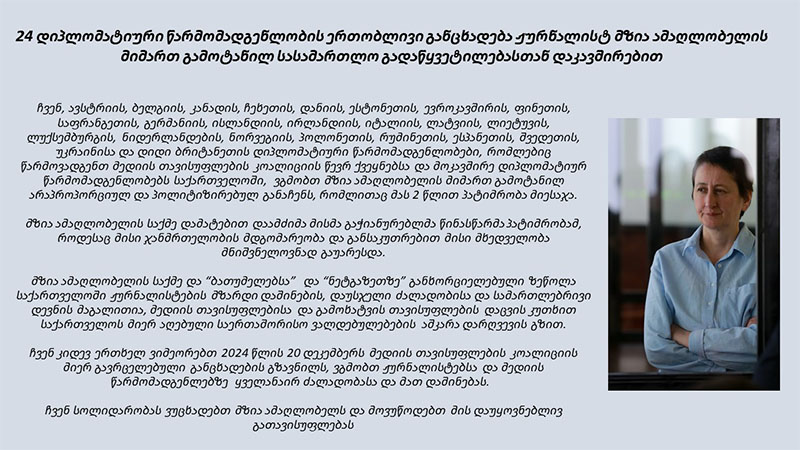 მზია ამაღლობელის საქმე დამატებით დაამძიმა მისმა გაჭიანურებულმა წინასწარმა პატიმრობამ, როდესაც მისი ჯანმრთელობის მდგომარეობა და განსაკუთრებით მისი მხედველობა მნიშვნელოვნად გაუარესდა,“ – ეს განცხადება 2025 წლის 6 აგვისტოს გააკეთა 24-მა დიპლომატიურმა წარმომადგენლობამ, ჟურნალისტ მზია ამაღლობელის მიმართ გამოტანილ სასამართლო გადაწყვეტილებასთან დაკავშირებით.
