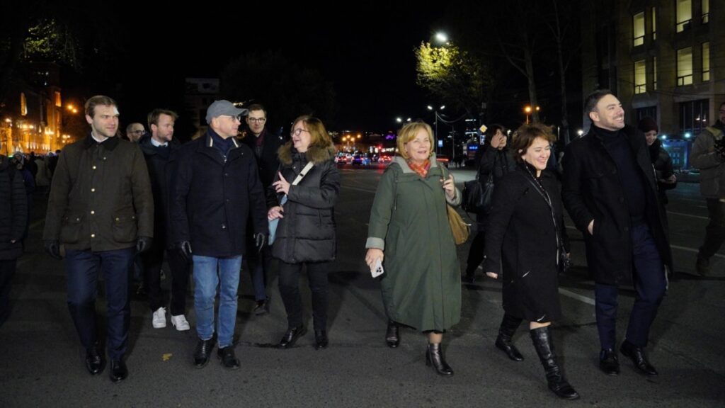 ევროპარლამენტარების 7-წევრიანი დელეგაცია, რომელიც საქართველოში 11 დეკემბერს ჩამოვიდა, პარასკევს საღამოს, 12 დეკემბერს, თბილისში, რუსთაველის გამზირზე მიმდინარე საპროტესტო დემონსტრაციაზე მივიდა.