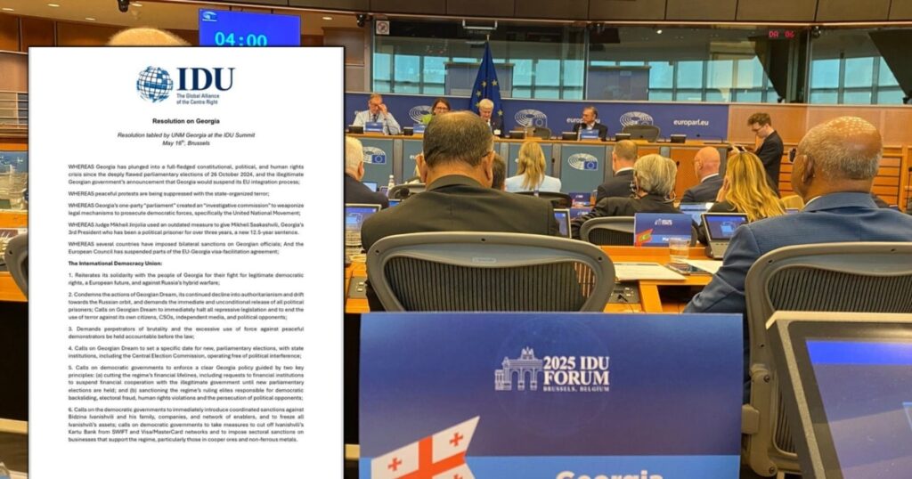 მემარჯვენე-ცენტრისტული და მემარჯვენე პარტიების საერთაშორისო ალიანსმა, “საერთაშორისო დემოკრატიულმა კავშირმა” (International Democracy Union IDU) საქართველოს შესახებ რეზოლუცია მიიღო. ამის შესახებ ინფორმაციას სოციალურ ქსელში პარტია „ნაციონალური მოძრაობის“ საგარეო მდივანი ზურაბ ჭიაბერაშვილი რეზოლუციის ტექსტთან ერთად ავრცელებს.
