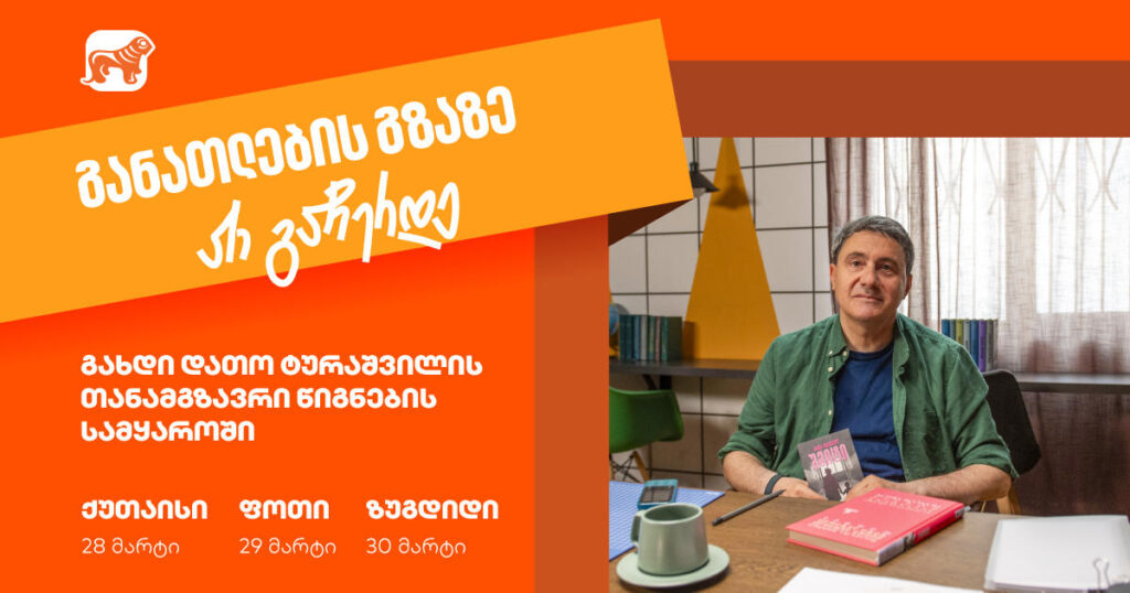 შეხვედრების სერიის ფარგლებში, დათო ტურაშვილი განათლების, ლიტერატურისა და წიგნის მნიშვნელობაზე ისაუბრებს. ამასთან, გაიმართება კითხვა-პასუხის სესია, გამოვლინდებიან გამარჯვებულები და მათ საჩუქრად გადაეცემათ დათო ტურაშვილის მიერ ხელმოწერილი წიგნები.