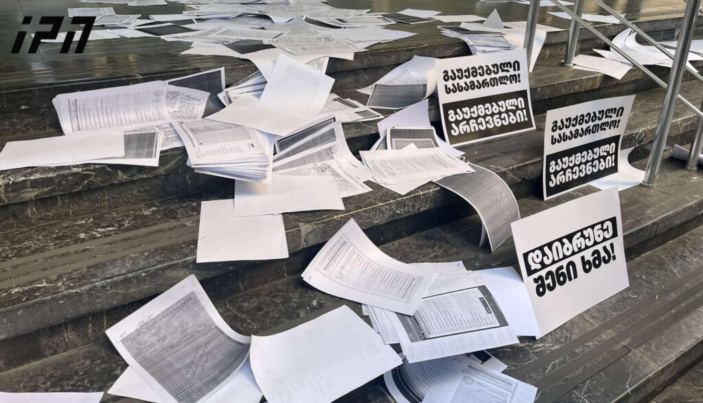 „ერთიანობა – ნაციონალური მოძრაობის“ წევრებმა სააპელაციო სასამართლოს წინ ფურცლები დატოვეს, რომელიც მათივე შეფასებით, მტკიცებულებებია, რაც ს გაყალბებას ადასტურებს