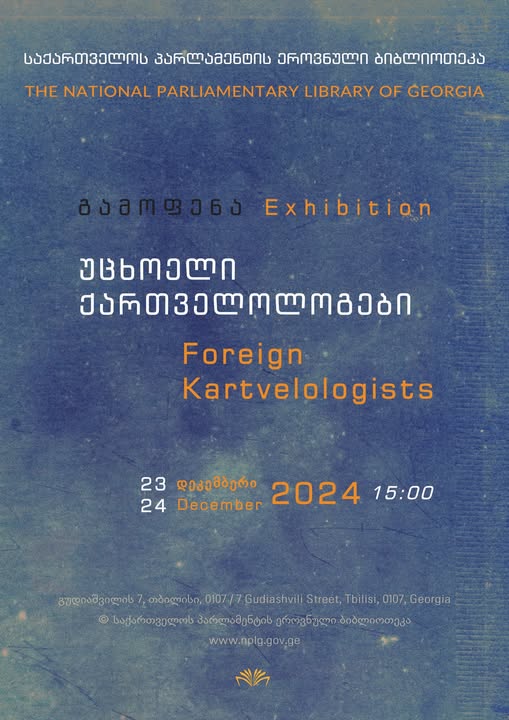 23 დეკემბერს 15:00 საათზე საქართველოს პარლამენტის ეროვნული ბიბლიოთეკის საგამოფენო დარბაზში გამოფენა „უცხოელი ქართველოლოგები“ გაიმართება.