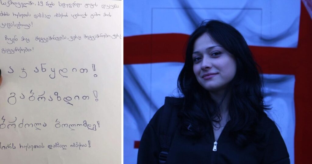 „ქართული ოცნების“ დეპუტატ მარიამ ლაშხის საჩივრის გამო დაკავებული ილიას სახელმწიფო უნივერსიტეტის სტუდენტი ლიკა ლორთქიფანიძე საკნიდან წერილს ავრცელებს და წერს, რომ „საქართველოში, 19 წლის სტუდენტი გოგოს დაკავება – „ძირს რუსეთის დამპალი იმპერიის“ ყვირილის გამო, არის კატასტროფა“: