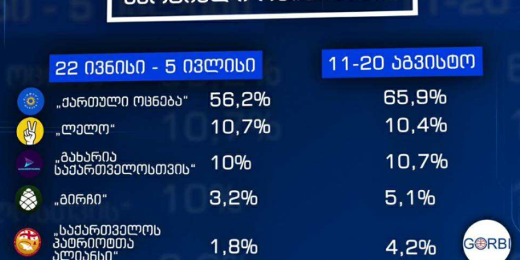 GORBI-ს წინა კვლევა ჩატარდა 22 ივნისი 5 ივლისის პერიოდში. მაშინ მმართველი პარტიის რეიტინგი 56.2% იყო, ეს მონაცემი კი დაახლოებით ერთ თვეში, 65.9%–ად იქცა.