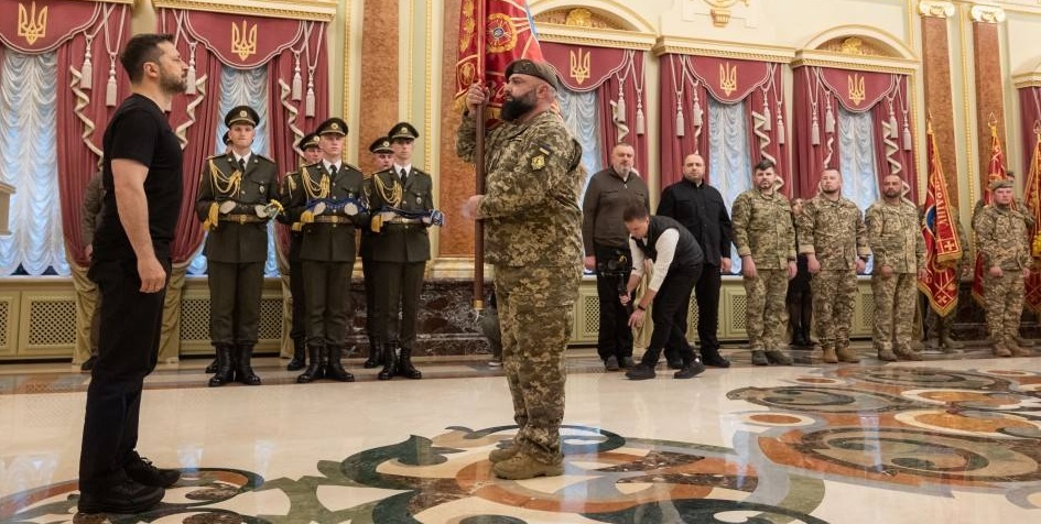 უკრაინაში მებრძოლ ქართველ სამხედროს, გიორგი ქუფარაშვილს პრეზიდენტმა ვოლოდიმირ ზელენსკიმ ქვედანაყოფის საბრძოლო დროშა გადასცა.