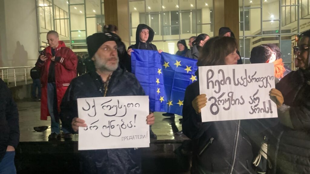 აქციის მონაწილეების განცხადებით, “არალეგიტიმურმა მთავრობამ” უკვე ღიად თქვა უარი ევროპულ კურსზე და ქვეყანა რუსულ რელსებზე გადაჰყავს.