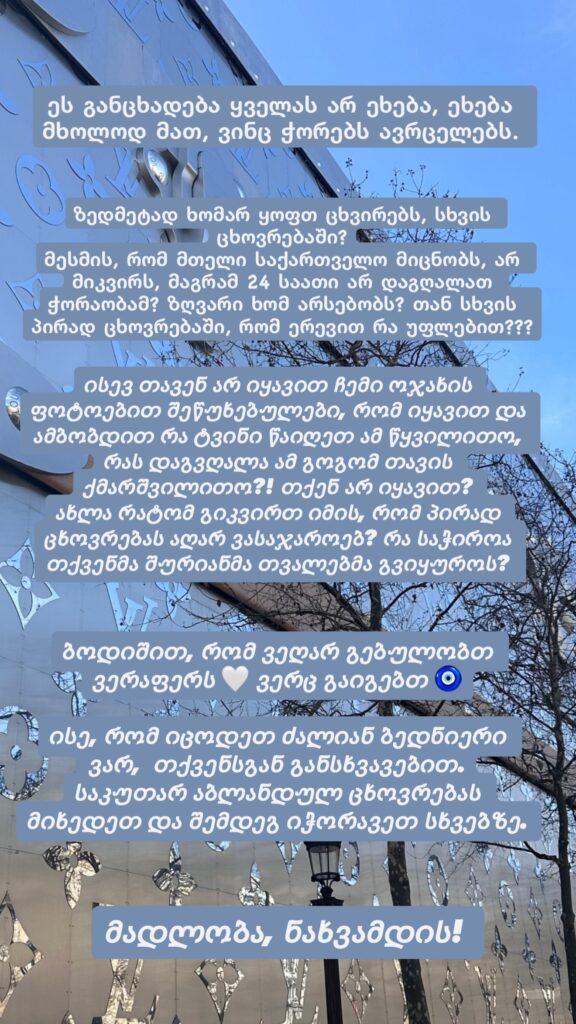 ისე, რომ იცოდეთ, ძალიან ბედნიერი ვარ, თქვენგან განსხვავებით. საკუთარ აბლანდულ ცხოვრებას მიხედეთ და შემდეგ იჭორავეთ სხვებზე”, – წერს სოციალურ ქსელში მოდელი და ინფლუენსერი მარიამ შუკაკიძე.