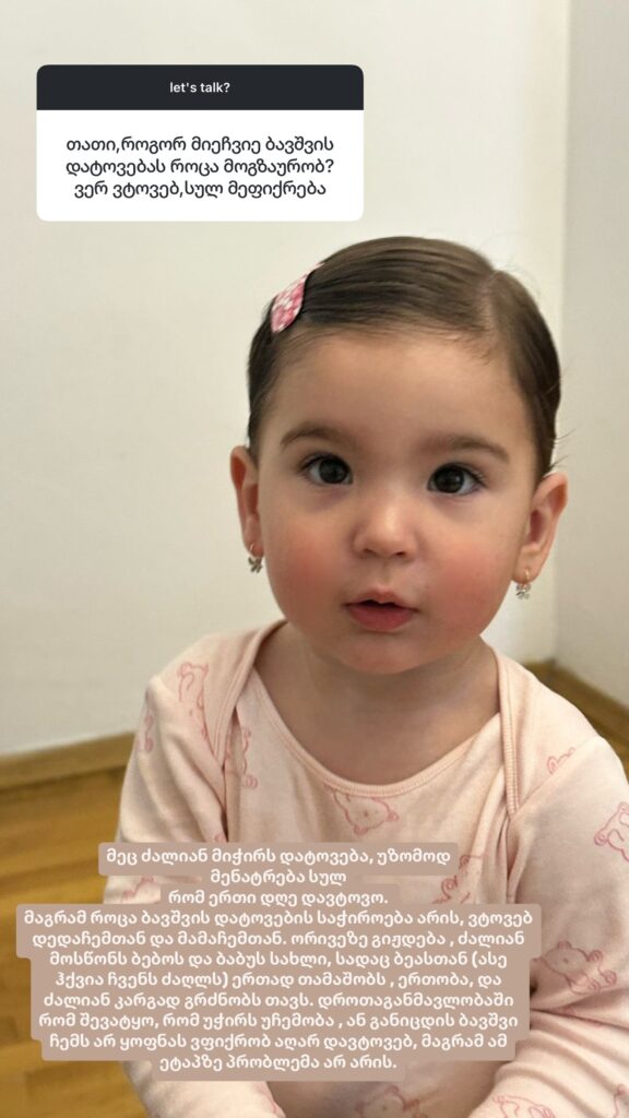 “ჩემი შვილი სულ რომ ერთი დღით დავტოვო, ძალიან მიჭირს და მენატრება. როცა ბავშვის დატოვების საჭიროებაა, ვტოვებ დედაჩემსა და მამაჩემთან, ძალიან მოსწონს ბებოსა და ბაბუს სახლი, სადაც ჩვენს ძაღლთან ერთად თამაშობს და თავს ძალიან კარგად გრძნობს”, – წერს თათია, რომელიც ხშირად მოგზაურობს და კადრებს სხვადასხვა ქვეყნიდან მეგობრებსაც უზიარებს.
