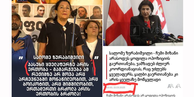 გატყუებთ ზურაბიშვილი, რომ რუსთაველზე დგომას აზრი არ აქვს, პირიქით – როცა ბევრი ვართ, ცივილური სამყარო იწყებს რეჟიმის წინააღმდეგ მოქმედებას. ამიტომაც გვითვლიან ხოლმე თავებს ქოცები.დასავლეთი კი იმით განსხვავდება საოკუპაციო ძალებისგან, რომ გვაკვირდება ჩვენ- მოქალაქეებს და როცა ვავლენთ ურყევ ნებას, საქართველო დაუბრუნდეს დასავლურ გზას, როცა ვაჩვენებთ უკომპრომისო ბრძოლას, სწორად მაშინ ხალხის მოკავშირე ხდება დასავლეთი. ჩვენი ნების დემონსტრაციის მიუხედავად, მხოლოდ რუსეთი ახდენს სამხედრო ინტერვენციას და/ან მარიონეტული მთავრობის მოყვანას. ჩვენი აქციებზე დგომა არის გამარჯვების ფორმულა და რა თქმა უნდა, ოპოზიციის ერთსულოვანი ბოიკოტი რეჟიმის წინააღმდეგ.არ ვიცი სალომე ზურაბიშვილის სუბიექტური აზრებით, როდის იყო ის გულწრფელი ახლა თუ 3 თვის წინ. შეგახსენებთ, ამა წლის 25 მარტს თქვა, რომ: “ჩემი მიზანი არასოდეს ყოფილა ერთობა”. დღეს ამბობს, რომ “ერთობა არის გამარჯვების ერთადერთი გზა”. არც ის ვიცი, სამთვეში ერთხელ, კვარტლურად სად იბარებენ ე.წ. ოპოზიციონერებს და რით აკაჩავებენ: მარტში ხაზარაძეც ფიქრობდა, რომ არჩევნებში მონაწილეობა ქოცობას უდრიდა, სამი თვის შემდეგ – პიონერი კანდიდატი გახდა აღნიშნულ არჩევნებში მონაწილეობის კუთხით.რაც შეეხება გამარჯვებას,გამარჯვების გზა ნამდვილად არის ბრძოლაში და ძალისთვის ძალის დაპირისპირებაში. აბა, ორბელიანიდან რუსთაველდე სეირნობით, მიკროფონთან დგომით და კეკლუცით ბინაში შეჭრილ უფასო მდგუმრებს ვერ გააგდებ, არა თუ – ოლიგარქს.უსწორესად შეაფასა ზურაბიშვილის დღევანდელი უსუსური გამოსვლა გიგი უგულავამ: “სალომე ზურაბიშვილი ერთობა” სალომე ნამდვილად ერთობა ლიდერობანას თამაშით და ამ თამაშით ივანიშვილი კვლავ წაუგებელს თამაშობს. ამიტომ, მნიშვნელოვანია, რომ არავინ აყვეს ამ ქალის ოქროყანულ ვნებებს – როცა არჩევნების ბოიკოტზე ოპოზიცია უნდა შეთანხმებულიყო, მაშინ ერთობა მისი მიზანი არ იყო, თავად თქვა. ახლა, როცა გაიყო პარტიები არჩევნების მონაწილეობის მიზეზით, ახლა ერთობა ერთადერთი გამოსავალიაო, ესეც თავად თქვა.ისღა დარჩენია ზურაბიშვილს, რომ შემდეგ აქციაზე “კურთხევა მოგვცეს” ყველანი არჩევნებზე – გინდ ჩემი ლელო გააფერადეთ, გინდ ჩემი გაქცეული გახოო… წაუგებელ პარტიას დაარიგებს ოლიგარქი თუ სალომეს კვლავ მოკავშირედ განიხილავთ ვინმე.აღარაფერს ვიტყვი დიპლომატი ქალის უგვანო ტონზე, ხალხის აღქმაზე და ა.შ. მადლობა ღმერთს, რომ ჭკვიანიც არაა და მხოლოდ მზაკვარია.