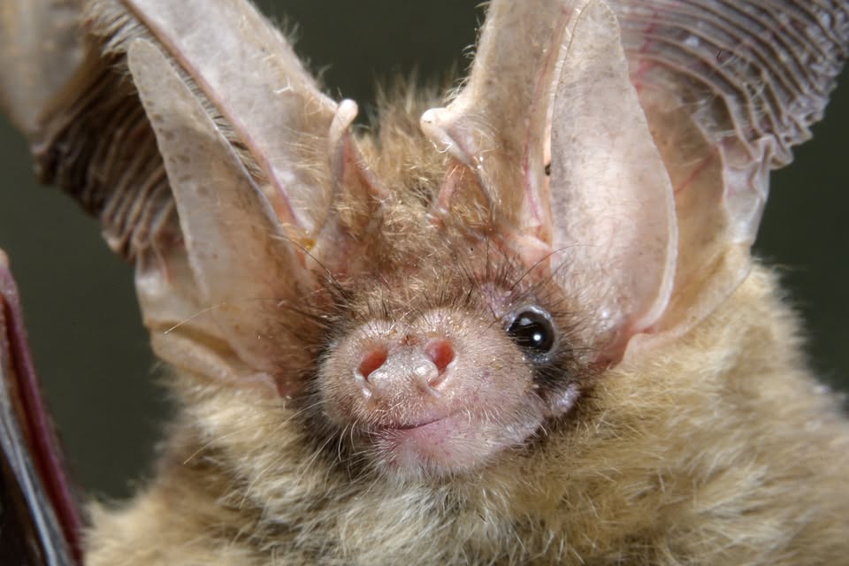 Common long-eared bat (Plecotus auritus). This species in summer roosts in treeholes and bark crevices and tries to find a cave or manmade shelter for winter. It hunts above woodland mostly for moths, but its diet also consists of earwigs, flies, and beetles, gleaning these insects from leaves and bark. It is a forest species of long-eared bat (ყურა). They are so sensitive that they rarely fall into the nets of scientists. The long-eared bats hunt in dense tree canopies and can locate their inse